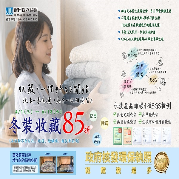 維持高品質的清洗標準,落實專業、環保、無味、不殘留的標準,別人洗不乾淨的衣物,交給潔屋洗衣