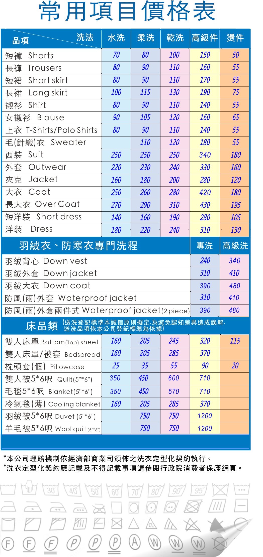 • 價格表所列為一般經常送洗的項目,其他未列之品項請洽門市人員。